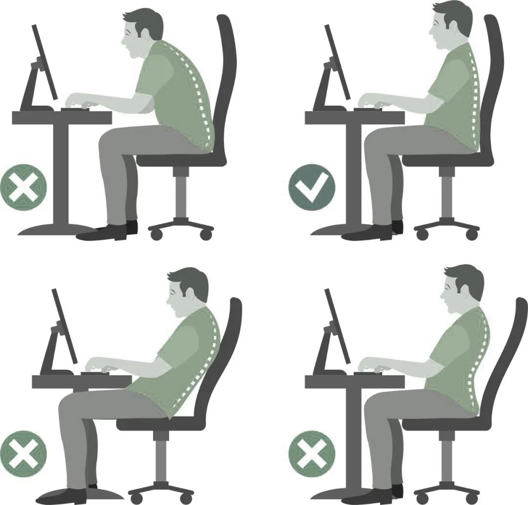 正确的坐立姿势远比健康的外貌来得更重要。由于脊柱负责整个中枢神经系统的正常运作,不良或过久的姿势常常可致脊柱过度疲劳或受压,令身体承受更大的痛苦。例如肺部正常功能受制约,引发呼吸系统毛病,而其他重要器官亦会同样面对相同的问题。以下是一些简单的方法去认知自己的姿势是否正确: